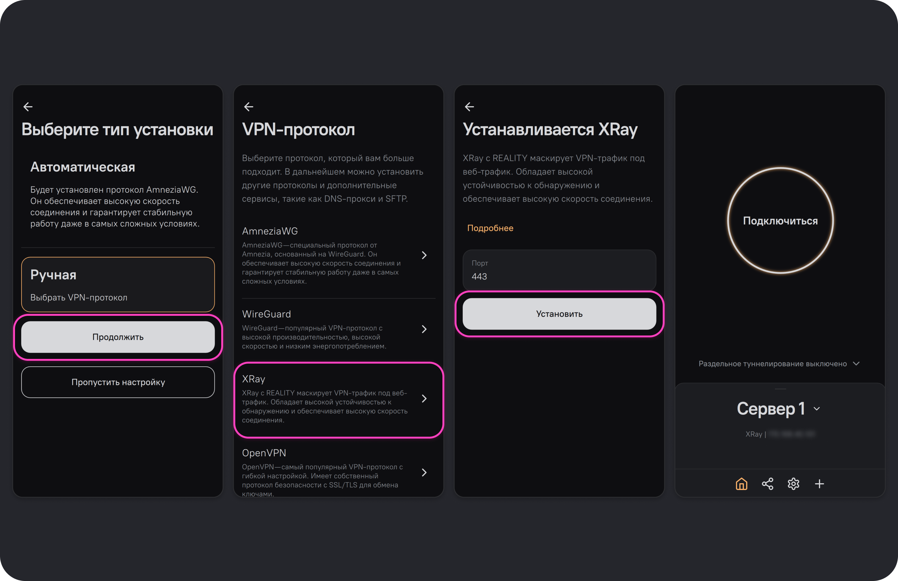 - Автоматическая — установится только протокол AmneziaWG, другие протоколы можно установить позже.