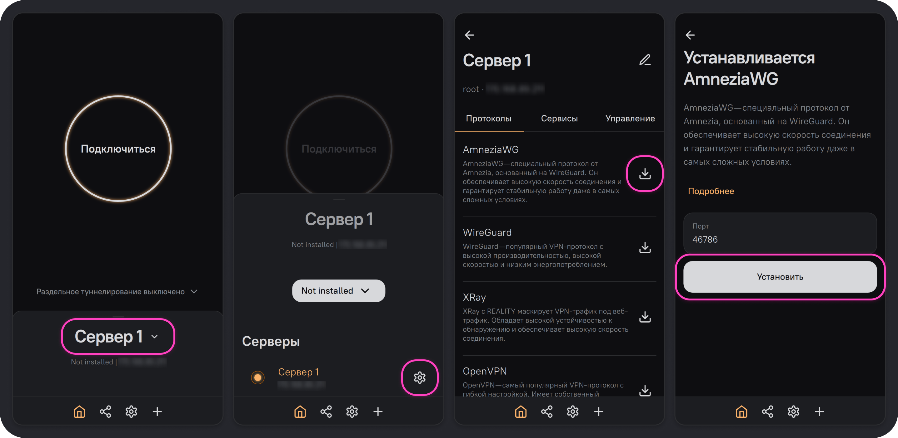- Диск (SSD): 10 ГБ или больше (требуется для работы Docker-контейнеров и сервисов).Настройка и управление сервером осуществляется через AmneziaVPN.