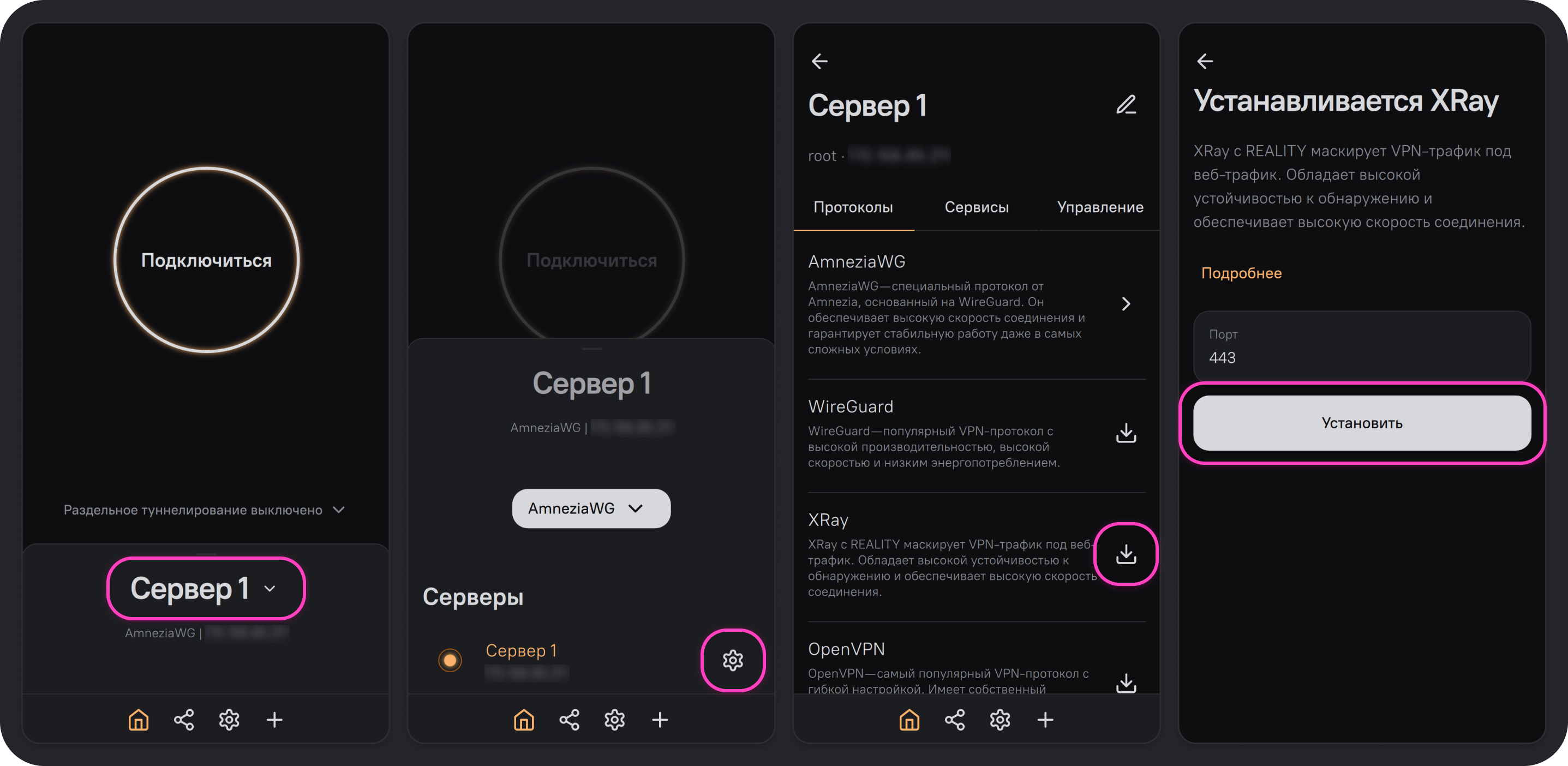 - Нажмите на иконку ⚙️ (шестерёнка) справа от подключения к вашему серверу — отобразится список всех протоколов, доступных для установки.